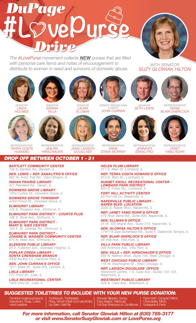 OAKBROOK TERRACE – State Senator Suzy Glowiak Hilton has teamed up with DuPage County legislators to host a Love Purse donation drive to support domestic violence survivors now through Oct. 31.