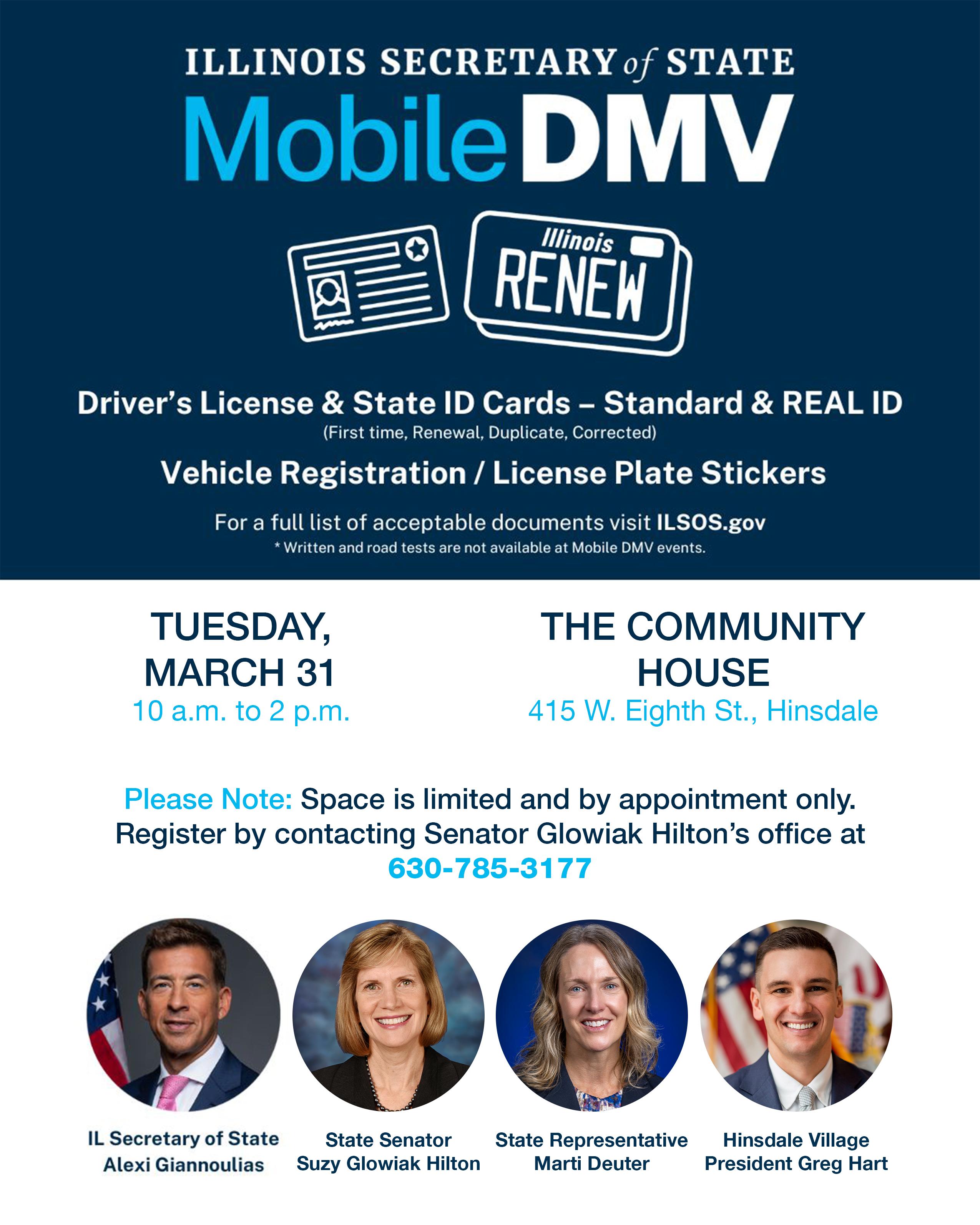 HINSDALE — State Senator Suzy Glowiak Hilton is partnering with the Illinois Secretary of State to offer Hinsdale residents a one-stop shop to renew their driver’s licenses, purchase license plate stickers and more.